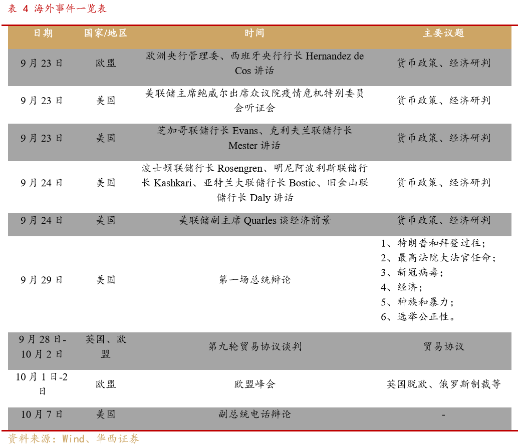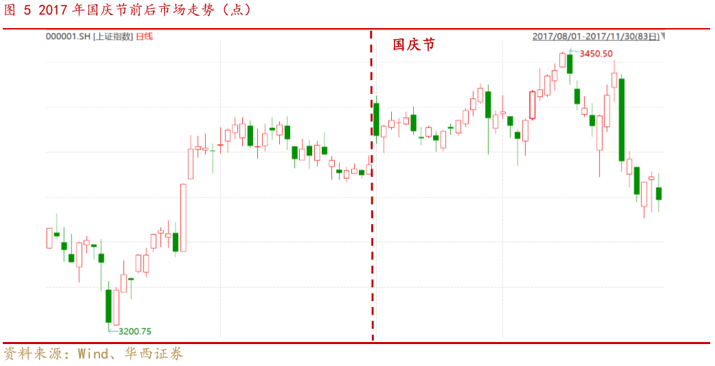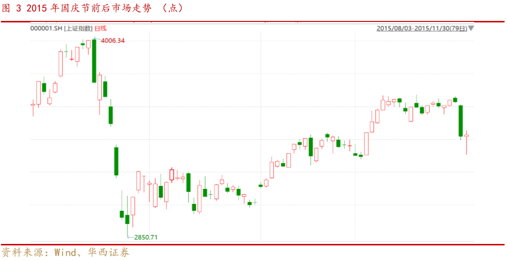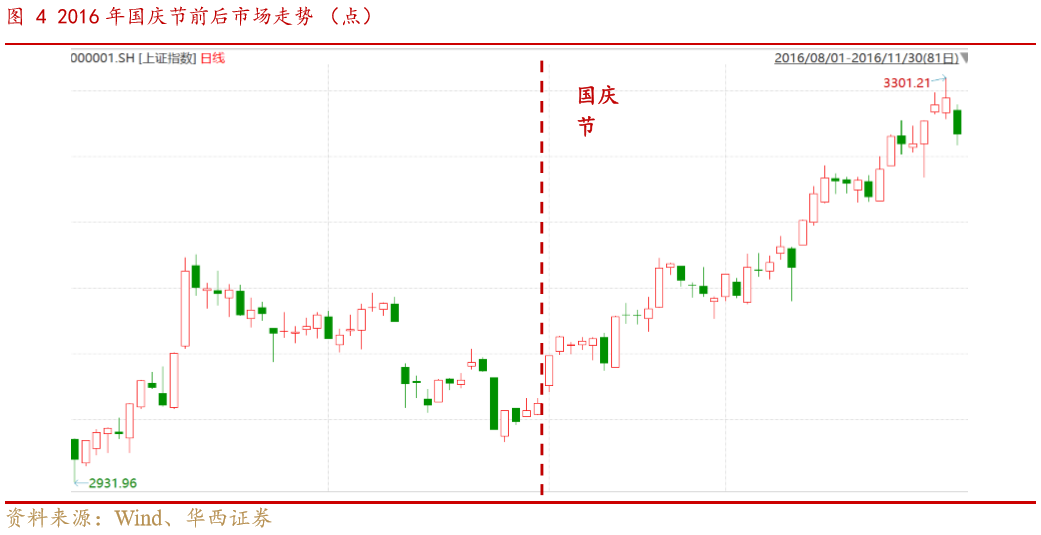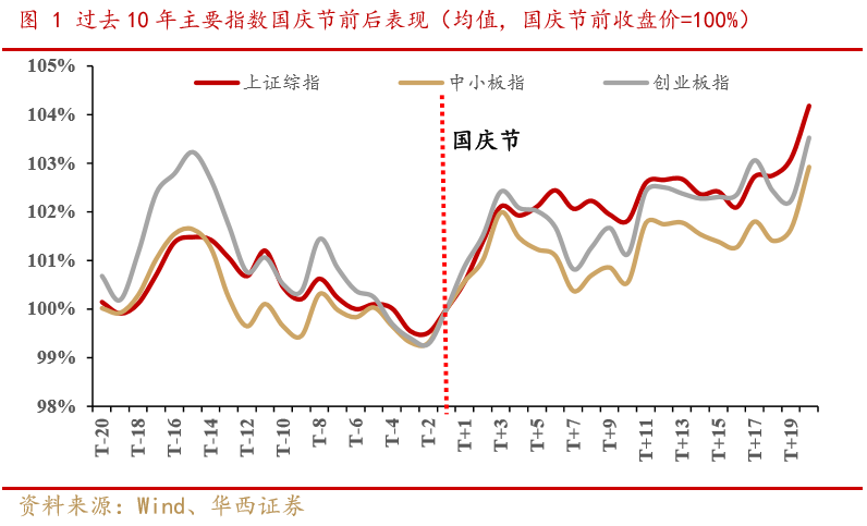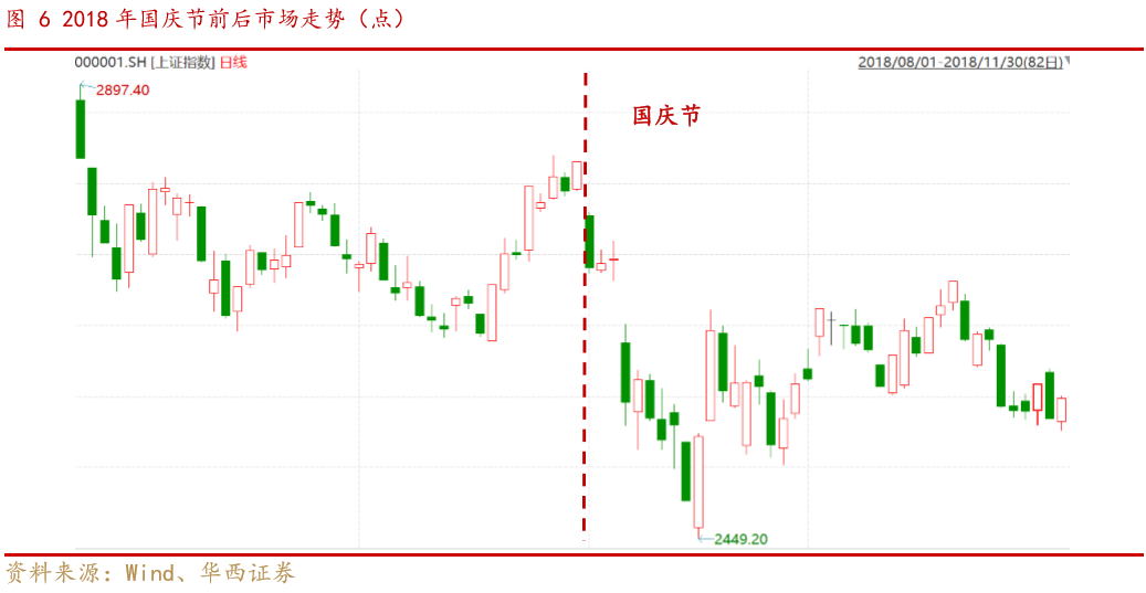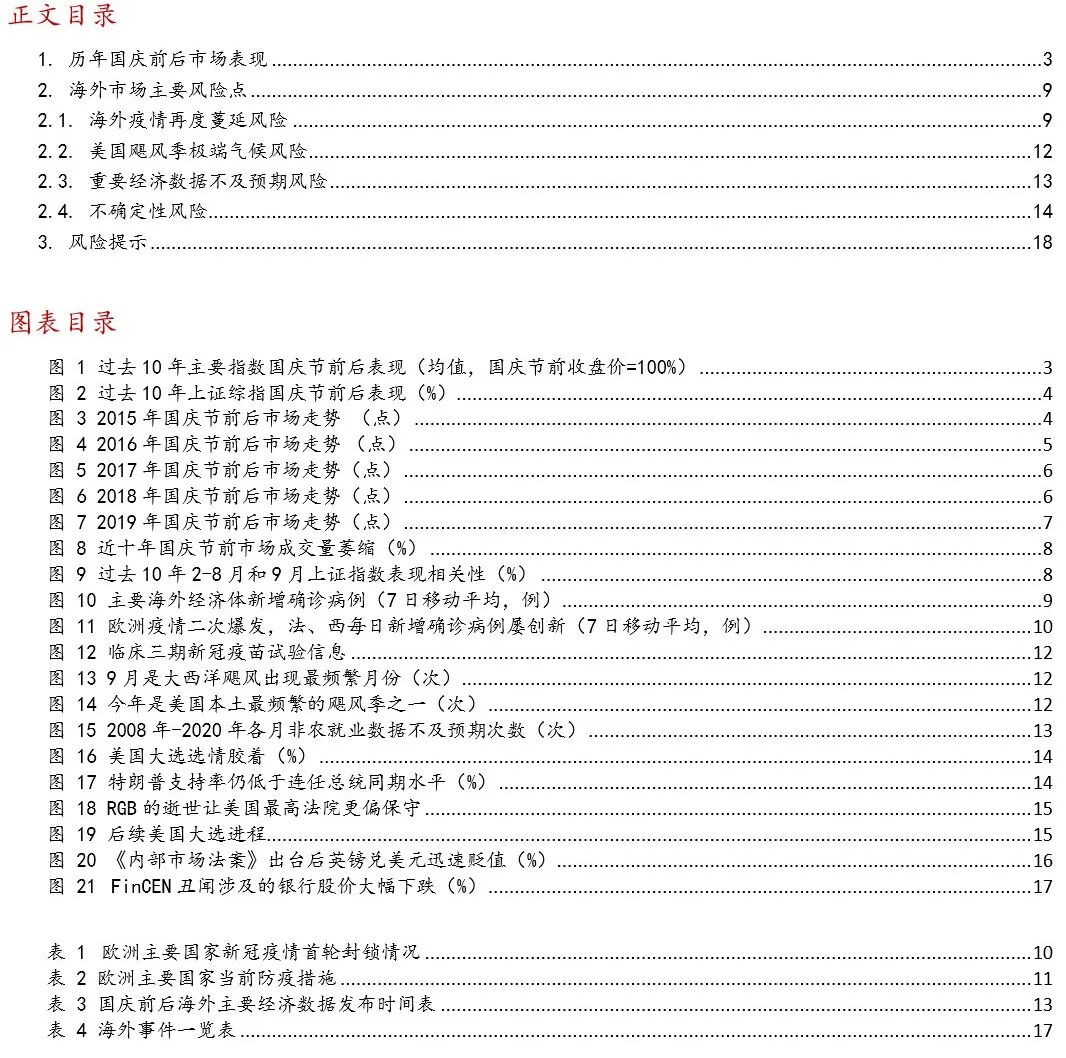 核心观点 近期受到海外疫情二次爆发,发达国家经济预期下修,美联储宽松节奏调整影响,全球市场呈现调整,我们在上上周报告《市场继续“中性”,风险释放后将重启“循环牛”》中明确提出“美国大选临近,欧元区疫情二次爆发,英国脱欧再起波折,美元指数仍然有阶段性走强风险”,在上周报告《风格切换还能延续吗?三论“循环牛”的启动条件》中进一步强调,“当前市场风险尚未释放完毕。海外避险情绪上升,短期之内难以看到外资主动的大幅流入。”近期全球市场走势也再一次验证了我们的判断。 伴随着国庆长假的临近,近期市场对于国庆长假持币还是持股的讨论又开始升温。从历史回顾来看,从过去十年节前情况来看,多数年份国庆节前市场均呈现明显调整,投资者节前仍需保持谨慎。 我们认为国庆节前市场调整主要来自于三个方面原因: 1)资金面季节性收紧,导致市场成交量萎缩。国庆节前由于季度末叠加商业银行长假期间资金备付需求,资金面容易出现季节性紧张。与往年相比,今年中秋与国庆双节叠加,假日较往年更长,资金压力也更集中。 2)绝对收益投资者提前锁定年内收益。对于考核绝对收益的投资者而言,往往从每年农历新年后开始逐步建立头寸,如果到9月初有一定收获,便会出现锁定收益的操作。从今年情况来看,前三季度市场行情火爆,也容易出现绝对收益投资者提前锁定收益情况。 3)长假期间容易出现海外风险事件对市场造成扰动。投资者需要重点关注:(1)当前海外疫情进一步爆发风险上升,欧洲部分国家面临新一轮经济封锁;(2)美国大选临近,需要担心美股波动率上升和特朗普对华进一步施压;(3)受飓风影响,美国经济数据可能低于预期;(4)英国脱欧仍然存在变数。 整体来看,当前投资者不宜操之过急,仍然需要耐心等待循环牛三个条件的达成。中期来看,我们认为驱动“循环牛”的核心并没有改变,在全球经济弱复苏,货币政策恢复正常化的背景之下,驱动A股上行的核心动力来自改革预期对于风险偏好的提振。从结构上看,短期关注三条市场主线,一方面,前期调整幅度较大,近期出现场外资金流入的强势板块值得投资者重点关注;另外一方面,关注十四五产业规划预期相关板块;第三方面,持续关注三季报高景气的方向。行业重点关注:医药、半导体、新能源车、光伏、汽车、建材、建筑、保险、银行、食品饮料等,主题建议关注能源安全、国企改革、数字货币等。 ■风险提示: 全球疫情超预期;全球经济复苏不及预期;中美摩擦升级超预期。 正文 01 历年国庆前后市场表现 我们考察了过去10年A股市场国庆节前后的市场表现。整体来看,A股历史上国庆长假前往往跌多涨少,少数年份(2018年)虽然长假前市场有所反弹,但是受长假期间海外市场波动影响,节后仍会存在补跌风险。而在国庆节后,市场整体上行的确定性相对较高。具体来看,我们梳理了2015年以来国庆节前后的市场表现,从调整的原因来看,历年调整的触发因素各不相同,但多数时候节后往往能消化负面因素,推动指数进一步上行。 整体来看国庆节前跌多涨少,节后多能扭转颓势。从过去10年数据(2010-2019年)来看,国庆节前20个、10个和5个交易日下跌的概率分别为40%、70%、60%;平均来看,过去10年国庆节前20个、10个和5个交易日涨跌幅分别为-0.05%、-0.58%、-0.15%。国庆节后5个、10个、20个交易日上涨的概率分别为80%、70%、80%;平均来看,国庆节后5个、10个和20个交易日涨跌幅分别为2.05%、1.82%、4.19%。 2015年下半年市场余波未平,在经历了8月中旬由于汇率波动引发的第二轮市场调整之后,8月底央行双降稳定了市场情绪,整个九月市场处于弱势震荡阶段,虽然有建国70周年、十三五规划等重大事件催化,但是市场热情不高,节前市场交投清淡,呈现缩量调整格局。在长假之后,市场风险偏好明显改善,受到决策层高度重视的新能源车产业链热度持续上升,也成为了2015年末的市场热点。 2016年在经历了年初调整后市场逐步爬坑,虽然市场已经逐步走出了颓势,但是整个市场情绪仍然笼罩在“慢熊”的阴影之下。另外一方面随着全球经济复苏进程加快,叠加国内供给侧改革推进,商品市场不断升温,市场对于经济的预期持续改善。由于2014年以来极度宽松的货币政策,叠加2015年对于房地产监管政策的放松,房地产成为了国内经济复苏的主要动力。而 8月下旬以来市场开始对于房地产调控升级的担忧不断上升,到9月份这一担忧逐步扩散为对中国经济复苏的担忧。这也促使整个9月市场呈现阴跌格局。而随着十一期间各地地产调控政策落地,市场利空出尽,开启了一轮秋季行情。 2017年,随着A股闯关MSCI成功,外资逐步成为了A股市场上的一股重要力量。相较于前期的低迷,2017年外资流入明显加速,伴随着北向资金的加速流入,A股自2017年6月-8月稳步上行,市场洋溢着慢牛的喜悦。但此时监管出手,使得市场风险偏好有所降温。9月8日和10日,沪深交易所和证券业协会规范股权质押交易,引发市场对于监管态度的担忧,随后公布的8月通胀(PPI)数据大超预期,也使得市场开始进一步担忧货币政策是否会出现转向,叠加外资流入趋缓,市场在冲过3300点后开启了步履蹒跚的震荡模式。但是随着9月30日央行超预期定向降准,叠加美国经济数据依然强劲,市场在长假过后一举突破3400点,开启了新一轮的上行行情。 2018年受到中美摩擦