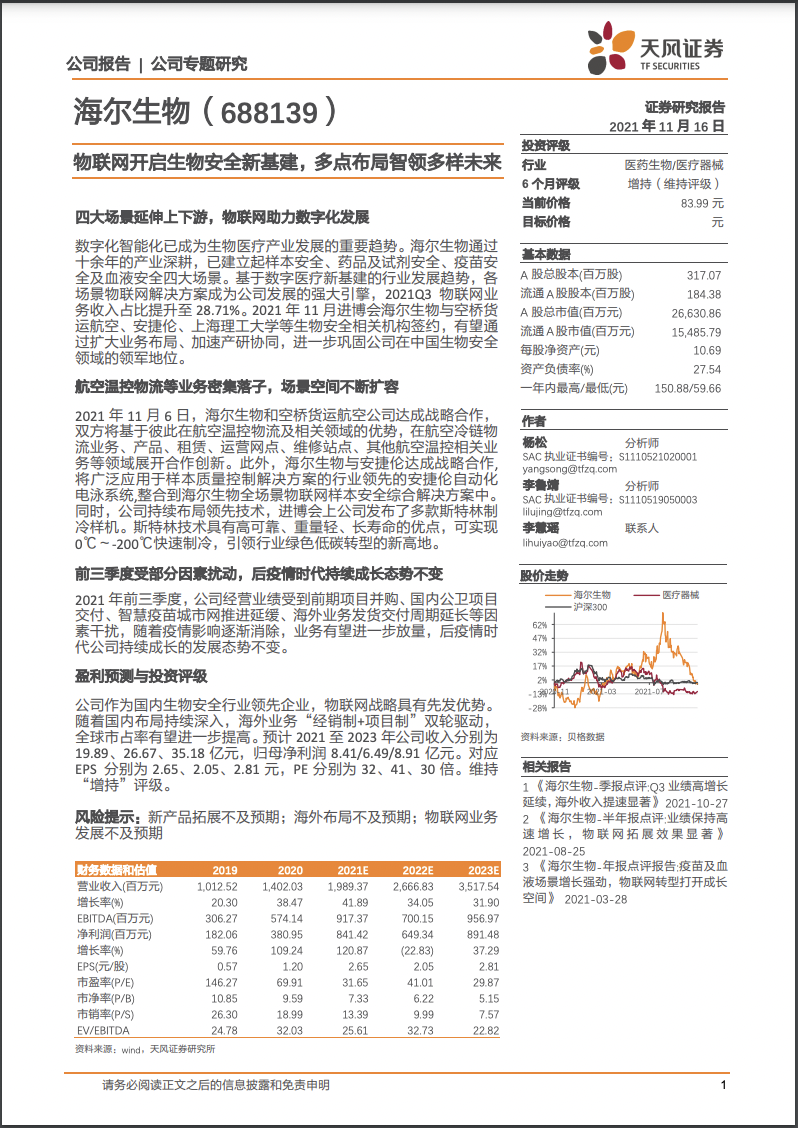 问题一:请介绍下公司的物联网方案业务的发展情况如何?答:以物联网方案业务为代表的场景综合解决方案一直以来是公司业务发展的重点方向,公司在占据先发优势的基础上持续与用户交互并进行产品方案的创新迭代,业务保持高成长态势。2021年前三季度,物联网方案业务收入增幅155.45%,占整体收入比重提升至28.71%。问题二:近期国家对国产医疗器械陆续出台了很多保护措施,是否会对行业有推动作用?答:今年以来,随着"十四五"规划及相关配套政策的推出,各地都在加紧为国产医疗器械拓宽绿色通道,提高国产设备采购率。例如,2021年3月,广东省卫健委发布了关于《2021年省级卫生健康机构进口产品目录清单的公示》,省级公立医疗机构可采购进口的医疗设备数量为46种,较2019年减少86种,强调优先采购国产设备。6月,北京协和医学院发布《传染病检测及营养健康实验室设备采购项目公开招标公告》,明确要求不接受进口产品投标。随着我国医疗器械企业技术进步及配套产业链的成熟,以及扶持国产产品等国家政策的推动,我国医疗器械行业迎来"进口替代"的快速发展机遇。劵商研报: