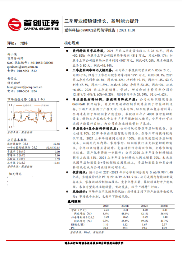 答:公司CAD/CAM相关产品主要包括切割设备应用软件和智能切割设备,尤其是控制设备运行的核心软件──精密运动控制系统是公司自主研发的。公司的下游客户行业广泛,客户需求差异较大。对不同行业的应用特点,公司开发了功能覆盖广泛的行业应用软件,销售时,与智能切割设备一起提供给客户。公司软件的底层核心软件系统是精密运动控制系统,其封装了自主研发高性能多轴运动控制算法和工艺算法库,用户只需设定参数便可适应不同材料、不同厚度材料、不同工艺的精确切割需求。目前提供的应用软件主要有广告行业专用软件、皮革材料专用软件、单层切割软件、多层切割软件、服装行业专用软件以及若干功能模块等。公司的产品性能与力克等国际知名公司相比除部分产品的少量技术参数外,系列产品的最大切割宽度、最大切割长度、最大切割厚度、切割精度、最大切割速度、最大切割加速度等技术参数上,已经实现与国外产品基本等同,部分指标甚至实现了超越。公司产品已经布局了海外市场,并与这些公司进行同台竞争。