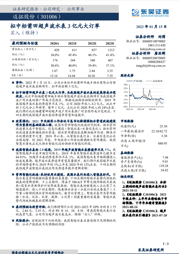 答:截至今天尚未收到中标通知书及签订合同,根据中标公示及招标文件内容该项目全部是户用超声水表(DN15\DN20\DN25),中标金额约3亿元,数量约40万只,3年的供货期,质保期12年,中标金额大约占公司2020年经审计营业收入的71%。项目如顺利实施对供货当年的业绩会有比较大的提升。该项目大批量使用超声水表证明公司在户用超声波水表领域有一定的先发优势、技术优势及品牌知名度;同时也证明了供水公司对超声水表的认可度在逐步的提高,对于超声水表后期的产品推广和渗透率的提升具有重要的意义。