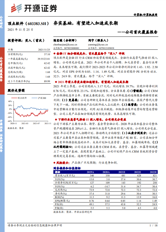 答:自主信创、持续创新是顶点软件始终坚持的发展战略。公司的信创布局较早,从一开始核心技术自研、数据库去"O"实践,先实现了交易体系的信创,然后全面国产化适配,再发展到所有应用全面国产化。证券最核心业务的交易体系的信创,其难度是最大的。公司的A5信创版从顶层设计的战略角度出发,在技术架构、内存数据库、交易中间件等核心基座实现去"IOE"、分布式等诸多创新与突破。A5信创版作为证券行业首家实现全面成功上线的全内存、全业务、自主可控的分布式核心交易系统,相继获得"2020年度国家金融科技发展奖二等奖"与"第七届证券期货业科学技术奖二等奖"。目前公司已拥有低延时高容量分区的HyperDB飞驰内存数据库、信创应用基础技术平台Live5灵动技术中台、分布式低延时高可用LoSAP交易中间件等多项基础研发成果。