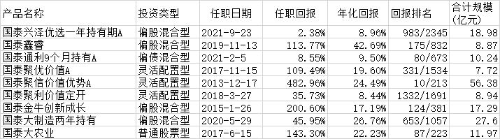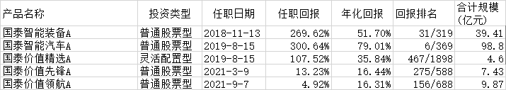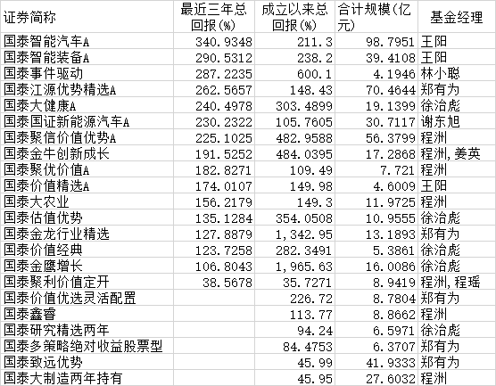 据天相投顾数据显示,根据基金季报统计,2021年176家公募基金管理机构全年基金总利润为7293.33亿元,平均利润为41.44亿元。国泰基金以旗下权益类基金183.04亿元的利润位居权益类基金赚钱榜第1(1/166),旗下非货币类产品全年利润210.78亿元,赚钱能力全市场排名第3(3/176)。基金公司利润数据为本期已实现收益加上本期公允价值变动损益,反映基金在一段时间给投资者赚了多少钱,也就是说定期报告中的利润数据,可以切实反映出公司的赚钱能力。很长时间以来“基金赚钱,基民不赚钱”都是一个老大难的问题,而这个榜单为我们选择基金提供新维度。国泰基金成立于1998年3月5日,是国内首批成立的基金管理公司之一。这家公司最大的特点就是一直秉承“低调做事,高调赚钱”的行事风格。2021年,在沪深300指数下跌5.20%大背景下,国泰权益类基金平均业绩为16.68%,超越沪深300指数21%以上。根据海通证券《基金公司权益及固定收益类资产业绩排行榜》,截至2021年底,在全市场前20名大中型权益基金公司中,国泰基金最近1年加权平均业绩排名前列,最近2年排名第2,最近3年排名第5。据wind数据显示,截至12月31日,国泰基金有国泰智能汽车、国泰江源优势精选、国泰价值优选、国泰智能装备、国泰大健康、国泰国证新能源汽车、国泰事件驱动、国泰聚信价值优势等17只主动权益产品近3年累计收益率超过100%。国泰基金旗下两只最老的权益产品国泰金鹰增长和国泰金龙成立至今均超过18年,长跑能力惊人。截至2021年12月31日,国泰金鹰增长累计收益率为1965.62%,超越沪深300指数近1500%,成立以来总回报位居灵活配置类基金第1(1/4)!国泰金龙成立累计收益率为1342.95%,跑赢沪深300指数近1000%,成立以来总回报位居灵活配置类基金第6(6/22)。资管行业从来都是业绩说话,所以尽管国泰基金低调,但投资者对于他们家十分信赖,公司管理总规模近些年实现跨越式增长。据choice数据显示,国泰基金截至当前管理总规模为5231.09亿元,全行业排名第20位。2018-2021年的管理总规模分别为2083.43亿元、2810.88亿元、4043.08亿元,5027.53亿元,近4年规模增长1.5倍。值得注意的是,即便是市场如此冷淡、多只产品募集失败的当下,国泰基金的产品依然备受关注,原计划发行14个交易日的国泰睿毅三年持有A提前结束募集。国泰基金表示,公司始终把持有人的利益放在最核心的位置,关注持有人的获得感,力争解决“基金赚钱,基民不赚钱”的行业难题,希望能够通过努力,让在各种市场环境中买入的投资者,拉长时间看都能有满意的投资收益。产品设计方面,推出封闭期、持有期产品,从产品底层设计的角度,帮助投资者管住追涨杀跌和频繁交易的动作,争取获得比较好的长期收益体验。国泰基金还表示,公司在设计基金产品的时候,会通过对每位基金经理的研究,精准匹配合适的产品,让合适的人管理合适的基金,在产品设计中,把认购规模控制在基金经理的能力圈范围内,不盲目追求“牛市”、“爆款”,防止由于基金产品规模过大而损害投资者利益,力争给投资者带来更好的持有体验。国泰基金之所以能有较强的赚钱能力,一方面得益于投研能力,另一方面则是得益于丰富的产品线。投研能力最直接的体现是基金经理,目前国泰基金在各年龄段、各赛道都有较为有实力的明星基金经理坐镇。在老将中,国泰基金有程洲、邓时锋、彭凌志等知名基金经理。其中程洲从业时间已经超过14年,邓时锋从业时间已经超过11年,彭凌志从业时间已经超过6年。程洲的代表产品为国泰聚信价值优势混合,截至2021年12月31日,在程洲自2013年12月17日上任以来实现收益482.96%,年化收益率达到24.49%,在同期灵活配置型基金中排名10/16。在中生代中,国泰基金有王阳、郑有为、徐治彪等人。其中王阳有11年证券从业经历和6年投资管理经验。王阳是市场上最早一批研究并投资新能源汽车的基金经理之一,在先进制造业、周期中游板块等方面具有多年的研究和投资积淀,选股能力突出。王阳的代表产品国泰智能汽车和国泰智能装备,截至2021年12月31日,王阳任期(王阳自2019/8/15起管理)国泰智能汽车实现收益300.64%,国泰智能装备实现收益269.62%,在同期普通股票型基金中排名6/369和31/319。郑有为是国泰基金均衡配置风格的代表人物,能力圈广泛,不拘泥于单一板块,在消费、周期、金融、科技、成长等领域均有优异的投资实绩。郑有为代表产品为国泰江源优势精选,截至2021年12月31日,自2019年6月14日郑有为上任以来实现收益213.83%,年化收益率56.50 %,在同期灵活配置型基金中排名70/1882。徐治彪专注于医药领域投资,擅长自下而上精选个股,逆势挖掘长周期具备持续成长性、高现金流、高ROE的公司。徐治彪代表产品国泰大健康,截至2021年12月31日,自2017年10月30日上任以来实现收益111.40%,在同期普通股票型基金中排名56/249。中生代基金经理经过快速的成长已经被市场和公司认可,上文提到的国泰基金的拳头产品国泰金鹰增长和国泰金龙已经分别交由徐治彪和郑有为分别管理。除了这些能够为投资带来超额收益的主动权益基金经理之外,国泰基金为投资者赚钱另一个重要的原因是不断完善、丰富和创新指数产品,满足不同风险偏好投资者的需求。最为典型的案例是近2年的大宗商品类指数产品。大家知道,由于地缘冲突原油价格一路高歌,油气类QDII基金在市场“一枝独秀”