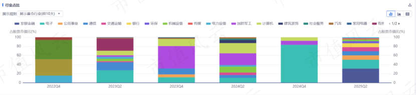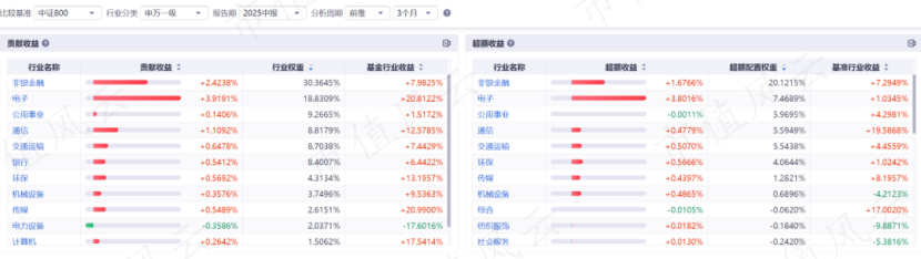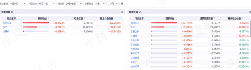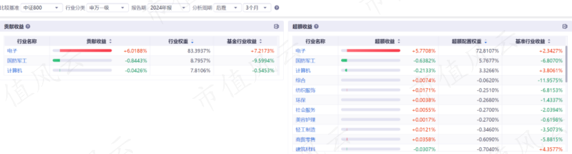 今年上半年押宝券商和电子,2024年4季度押宝电子(占基金净值比高达76.23%),2024年上半年押宝军工、计算机和机械设备,2023年下半年押宝军工(占基金净值比高达45.20%)
