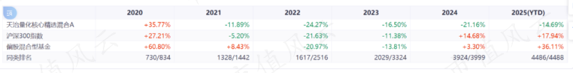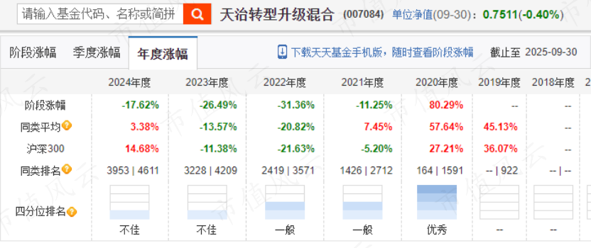 并且,在2020、2021、2024年以及今年,其业绩在同类基金中排名持续倒数!