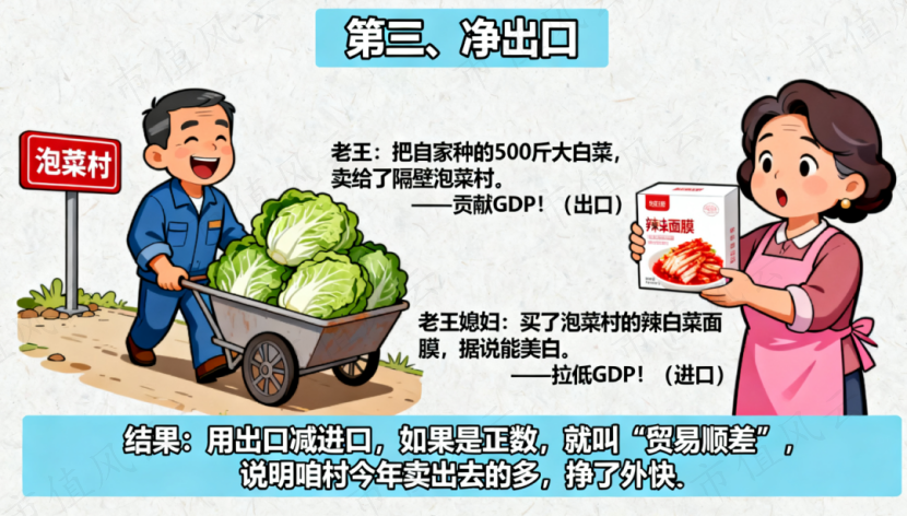老王把自家种的500斤大白菜卖给隔壁泡菜村,这是出口,贡献GDP!
