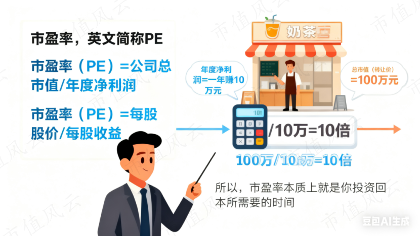 在股市里,我们衡量一家公司“贵不贵”的尺子就叫——市盈率(PE),或者叫估值,它的底层逻辑就是刚刚算的“回本年限”!
