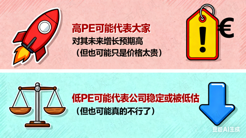 简单口诀: 高PE可能代表大家对其未来增长预期高(但也可能只是价格太贵);低PE可能代表公司稳定或被低估(但也可能真的不行了)。