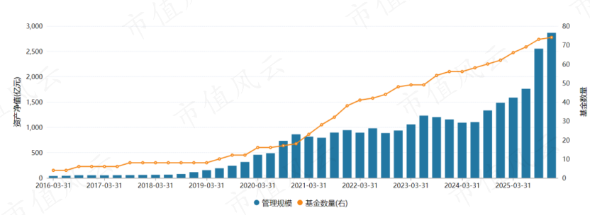 截至2025年三季度末,永赢基金非货规模达4289亿元,行业排名第18位。相较于2024年末,非货规模增长超770亿元。 分类型来看,永赢基金的股票型基金、混合型基金、ETF三类产品规模均接近翻倍,展现出较为全面的发展势头。