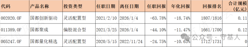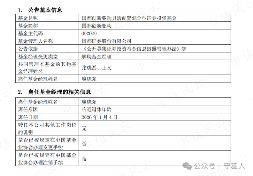 2026年1月7日,国都基金发布公告,基金经理廖晓东因临近退休年龄,卸任其管理的国都聚成混合与国都创新驱动两只基金,并且已经在中国基金业协会办理变更手续。