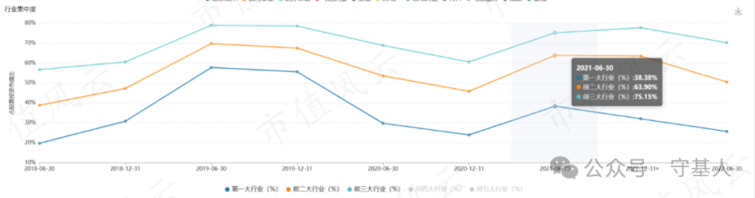尽管国都量化精选的名字中带量化,但是丝毫没有体现“行业分散+持股分散”的量化特征。尤其是在廖晓东参与管理之后,该基金第一大重仓行业占比一度高达38.38%,前十大重仓股占比接近60%。