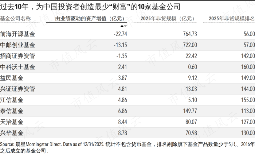 从反向榜单来看,过去十年未能有效创造价值的基金公司,大多为中小型机构。
