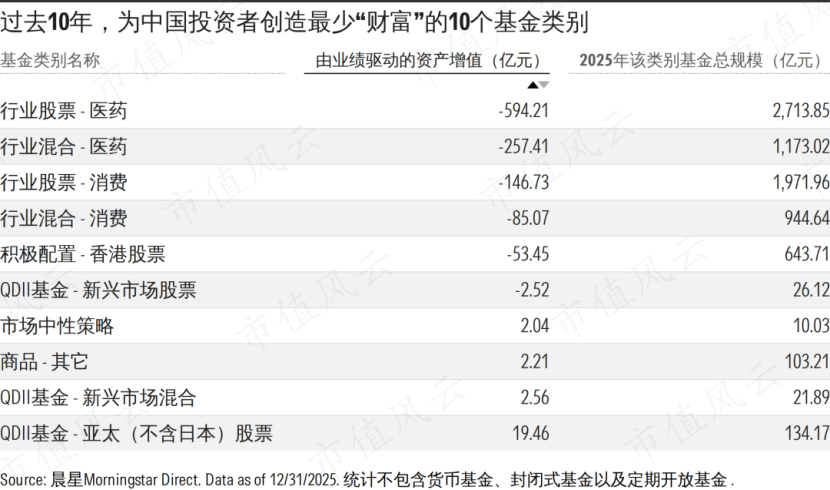 进一步细分,让中国投资者财富损失最大的,是4个主要投资消费和医药行业基金类别。以实际金额测算,在过去10年中,这四个类别让持有人遭受了85亿至594亿元不等的财富损失。