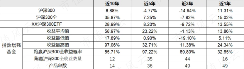 此外,沪深300指数增强基金的收益平均指在近3年、近5年和近10年分别跑赢沪深300全收益指数6.69%、15.97%和23.10%,这个超额收益还是相当诱人的。