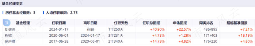 至于业绩嘛,胡健强自2024年1月开始接管产品,累计管理1年又250天,任期收益率40%,年化收益率22.57%,同类排名436/895,业绩算是中规中矩。