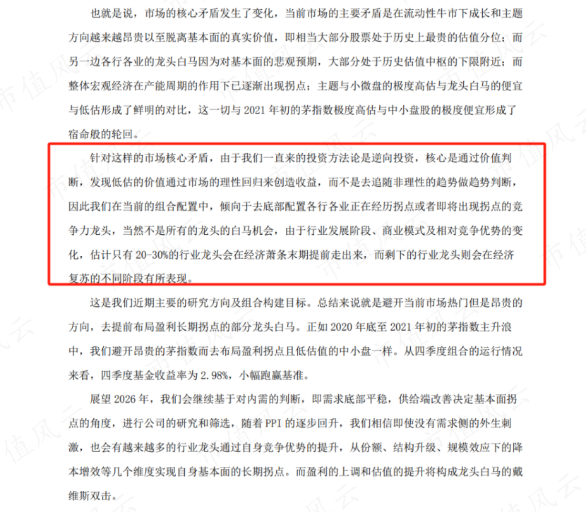 我们继续看杨金金的季报,对于当下市场的矛盾,杨金金的投资方法论是逆向投资,核心是通过价值判断,发现低估的价值通过市场的理性回归来创造收益。因此在当前的组合配置中,倾向于去底部配置各行各业正在经历拐点或者即将出现拐点的竞争力龙头。