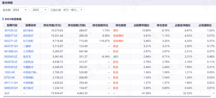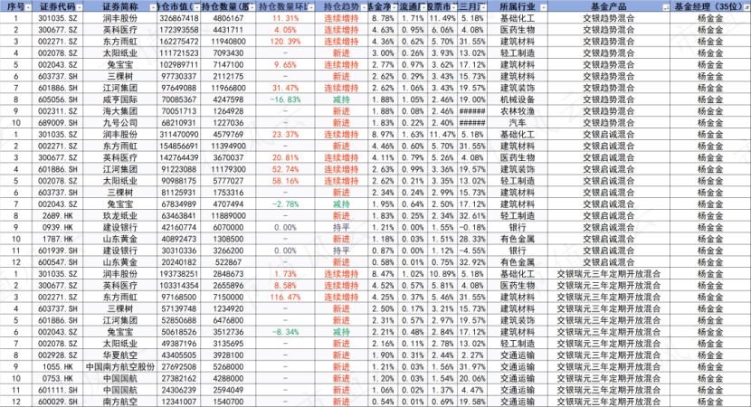 以东方雨虹为例,杨金金在2025年3季度开始配置东方雨虹,买入541万股,4季度加仓到1194万股。