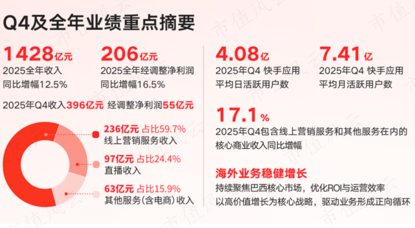 电商业务的变化最具警示意义。第四季度GMV同比增长12.9%至5218亿元,这一增速远低于公司此前的高增长阶段。更值得玩味的是,快手宣布从2026年起不再单独披露GMV数据,这一动作被市场普遍解读为“高增长故事面临终结”的信号。