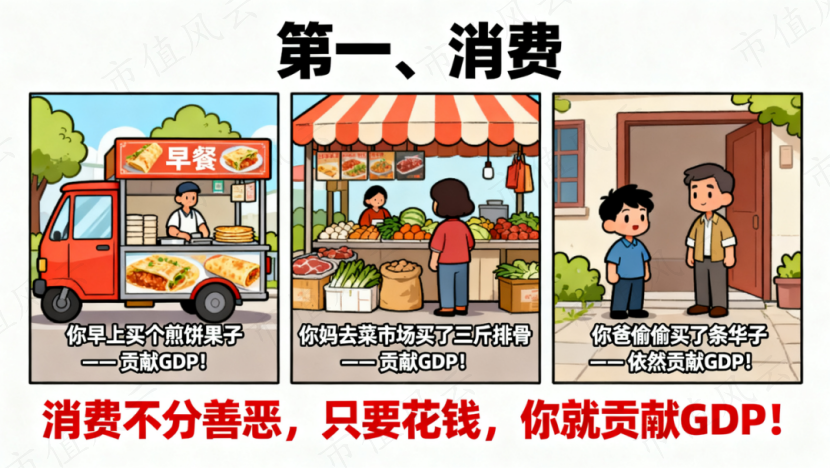 每个人、每个家庭、每个企业,一年消费和支出加起来,就是GDP 。
