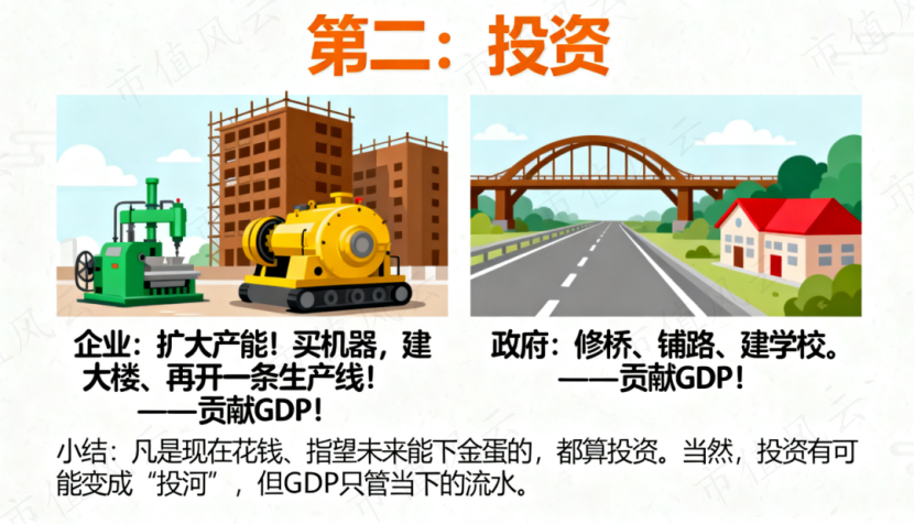 凡是现在花钱、指望未来能下金蛋的,都算投资,都会贡献GDP。