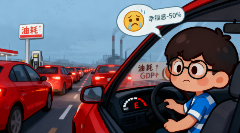 它也不关心你“快不快乐”:因为堵车,你浪费了更多油,你的幸福感暴跌,但会拉动GDP。