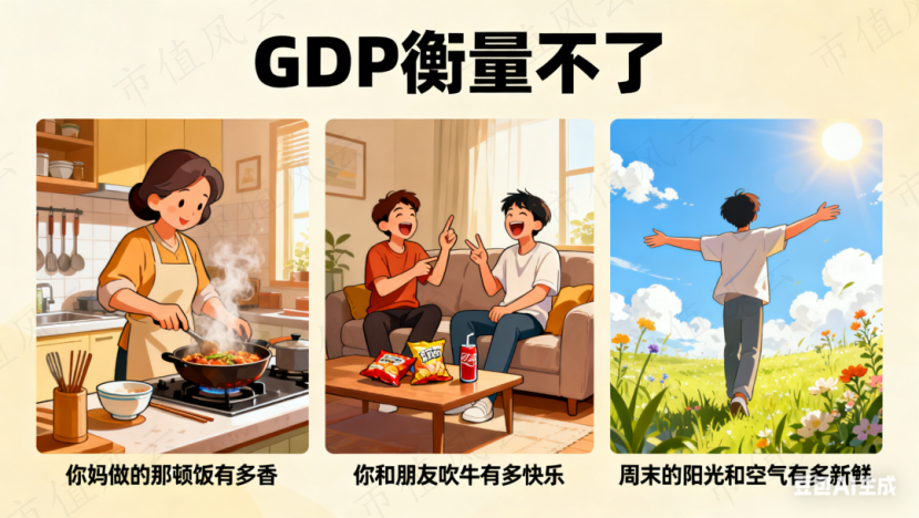 它不衡量“家人的爱”:母亲悉心照顾孩子,付出无数心血,不计入GDP。